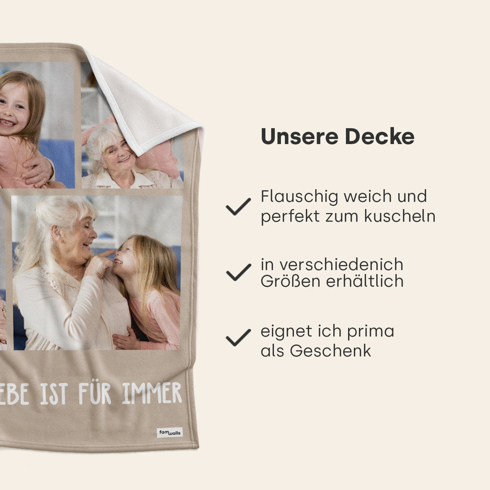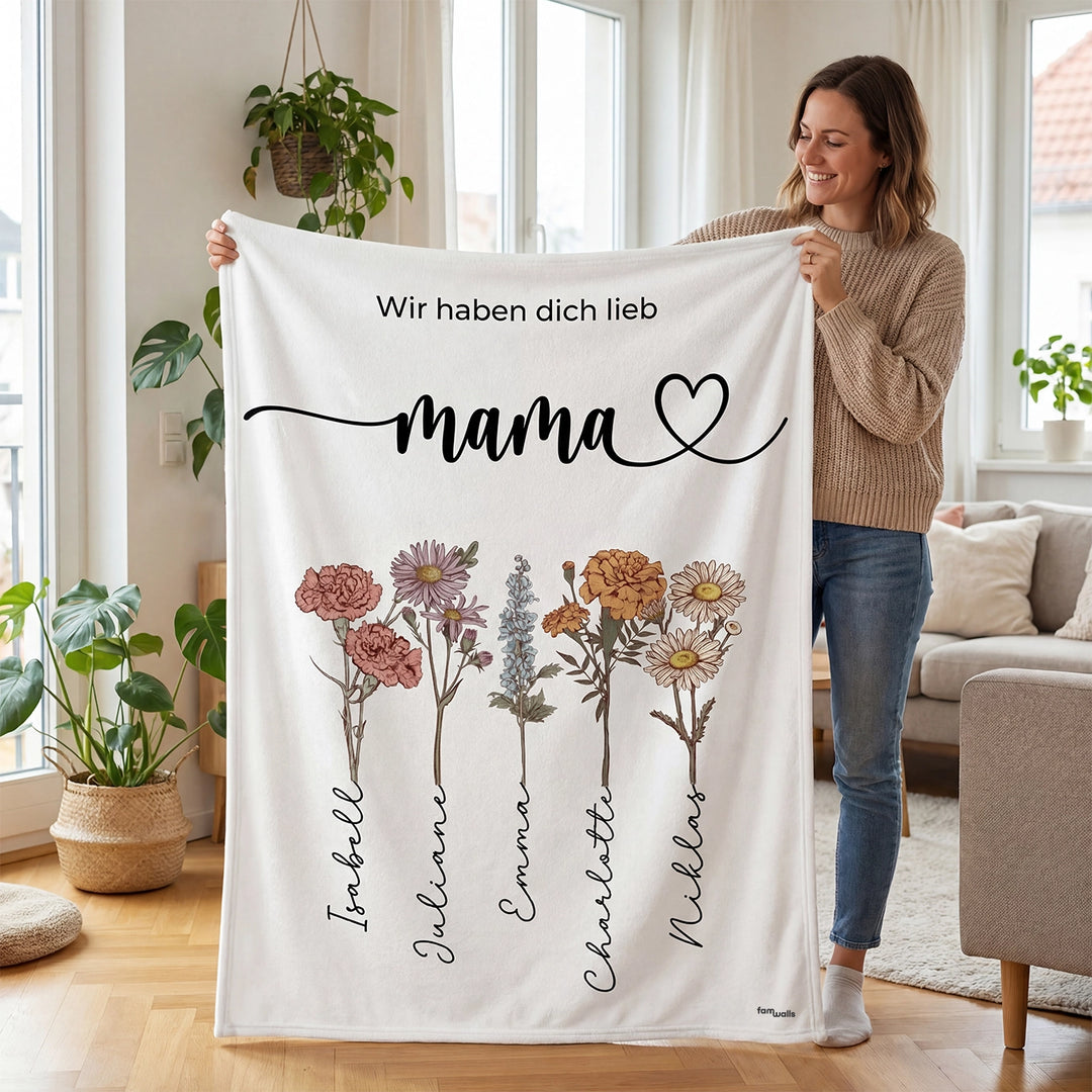 Personalisierte Geschenkideen werden immer beliebter, denn sie sind einzigartig und sorgen für Freude beim Beschenkten. Ganz hoch in der Gunst stehen unter anderem personalisierte Decken. Wir von famwalls bieten dir gleich drei Varianten der individuellen Kuscheldecke an. Die personalisierte Decke mit Text ist das Produkt, das immer und zu jedem Anlass passt. Immerhin kannst du jeden beliebigen Text verwenden und die Decke damit zum Unikat machen. Der Klassiker ist unsere Kuscheldecke, die mit deinem eigenen Foto bedruckt wird. Du möchtest deiner Mama zum Muttertag eine besondere Freude machen? Dann können wir dir unsere Decke "Blumenstrauss" empfehlen. Dieses tolle Erinnerungsstück ist in vier Farben erhältlich und kann natürlich mit deiner eigenen Textzeile bedruckt werden. Auch die Anzahl der Blumen kannst du frei bestimmen.