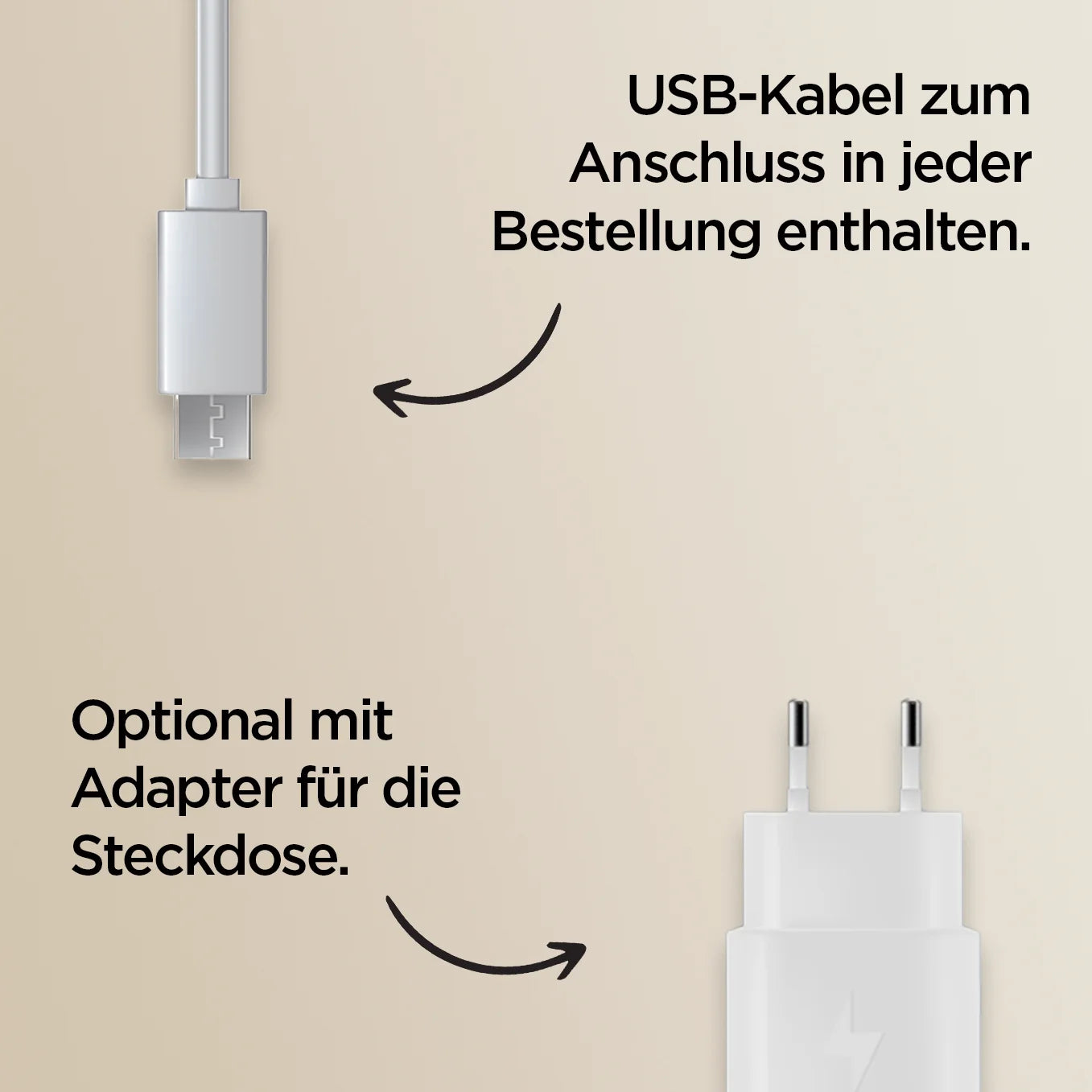 +Ja, ein USB-Kabel ist im Lieferumfang enthalten. Optional kannst du ein passendes Netzteil dazu wählen.