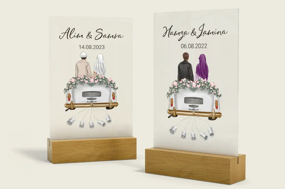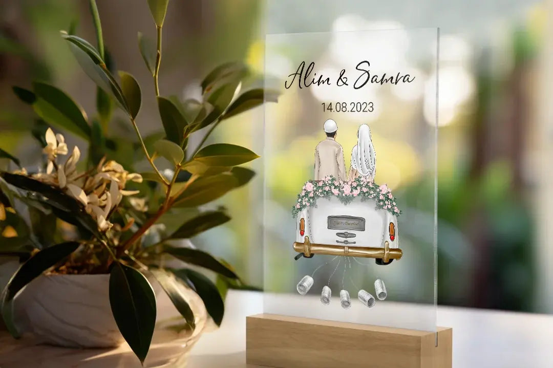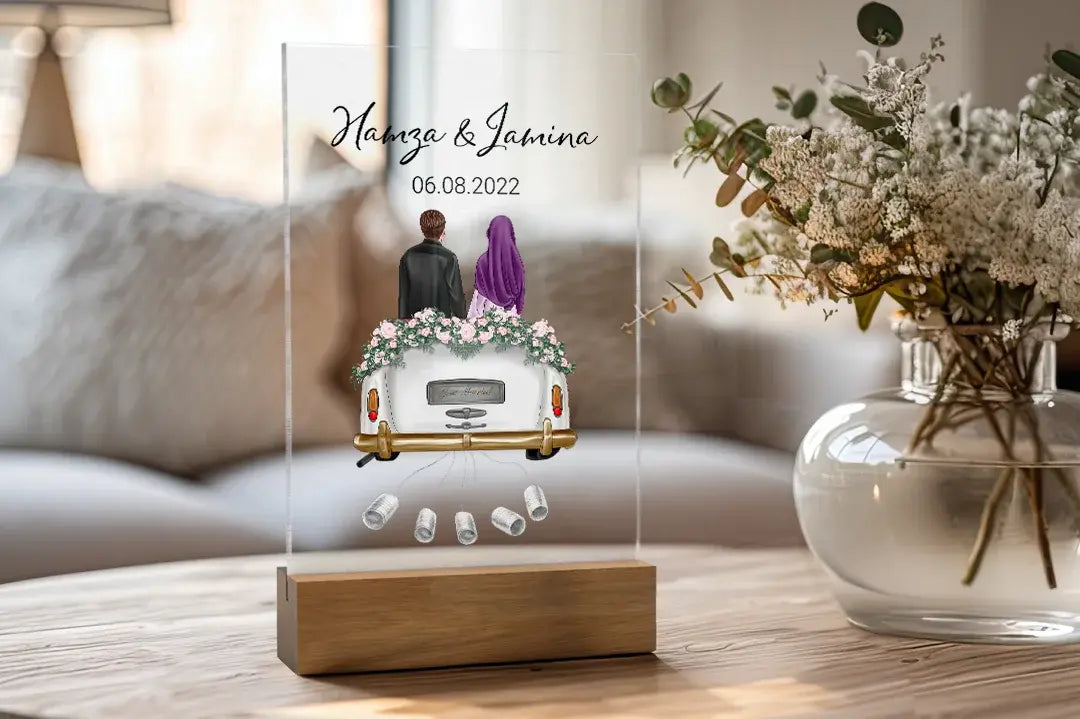 +Die Acryltafel zeigt stilvoll illustrierte Dosen am Hochzeitsauto, an denen du echte Geldscheine mit kleinen Bändern oder Clips befestigen kannst.