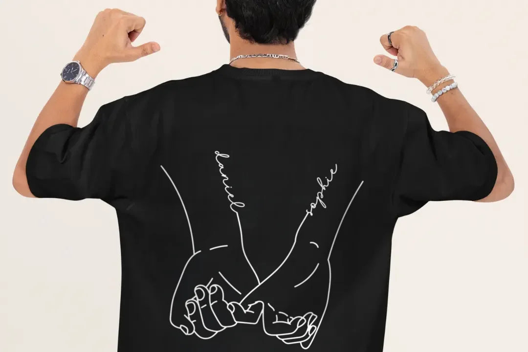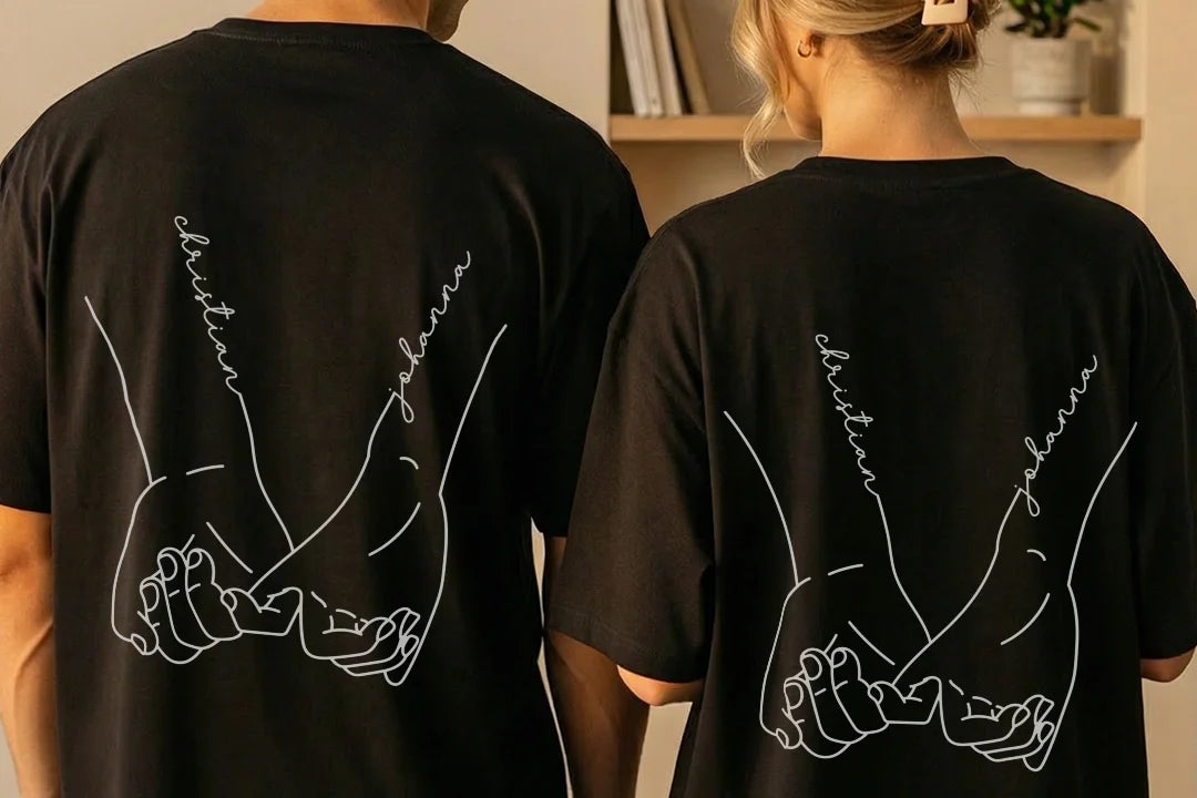 +Deine Wunsch-Namen werden hochwertig auf die Rückseite der Shirts gedruckt – als Teil des stilvollen Hand-in-Hand-Designs.