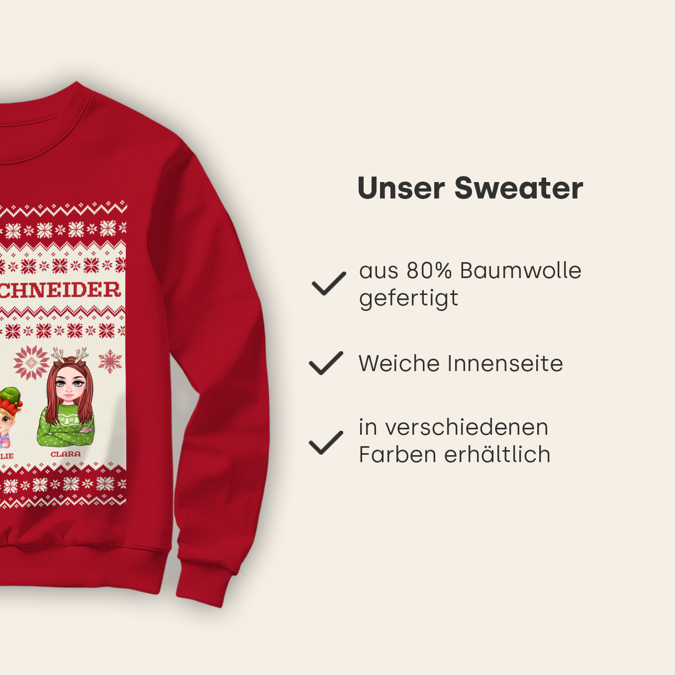 +Du kannst bis zu 8 verschiedene Charaktere auf deinem Sweater gestalten. Perfekt für große Familien oder Freundesgruppen!