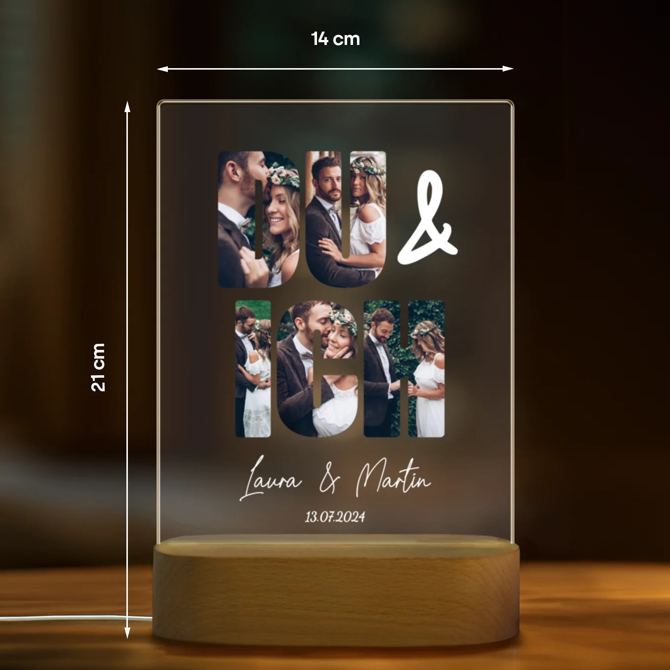 +Das Licht besteht aus klarem Acrylglas mit einem Holzsockel – modern, stabil und hochwertig verarbeitet.