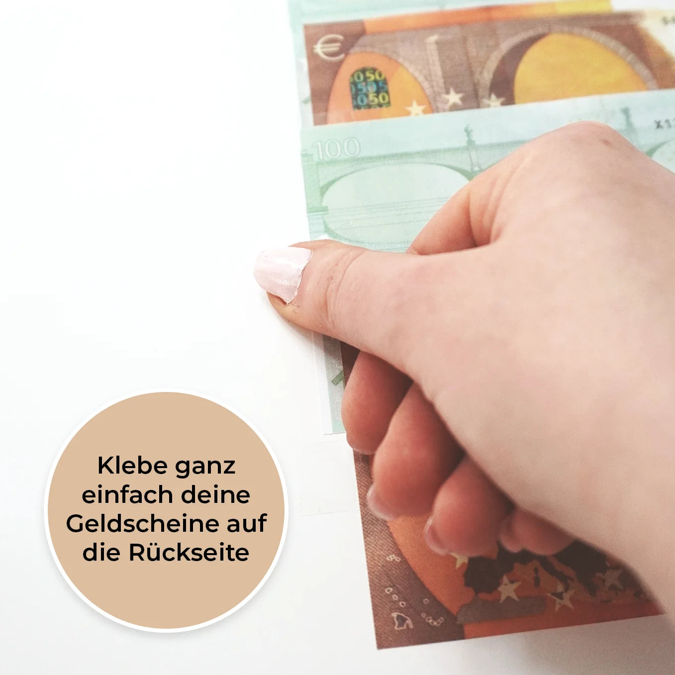 +Ja, das Poster wird bereits ausgeschnitten zu dir geschickt. Du musst also nur noch deine Geldscheine mit Klebeband hinterlegen.