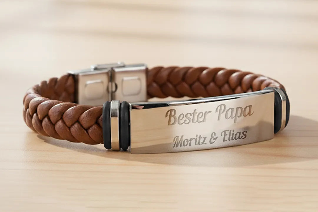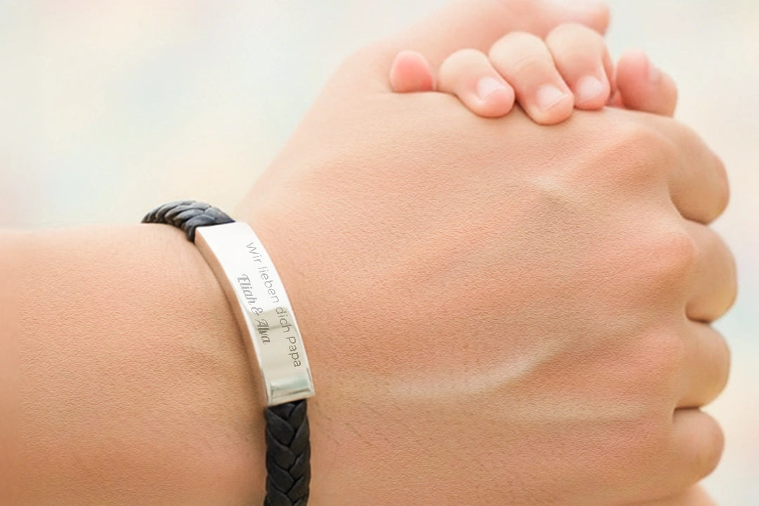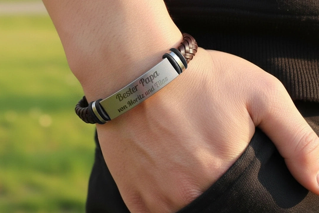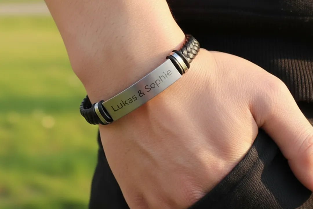 +Das Armband besteht aus robustem Kunstleder und einer gravierten Edelstahlplatte – langlebig und hautfreundlich.