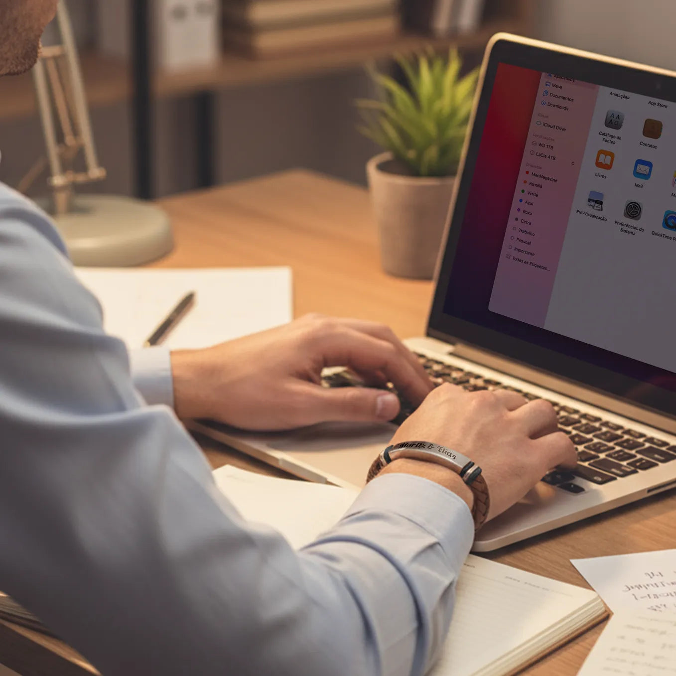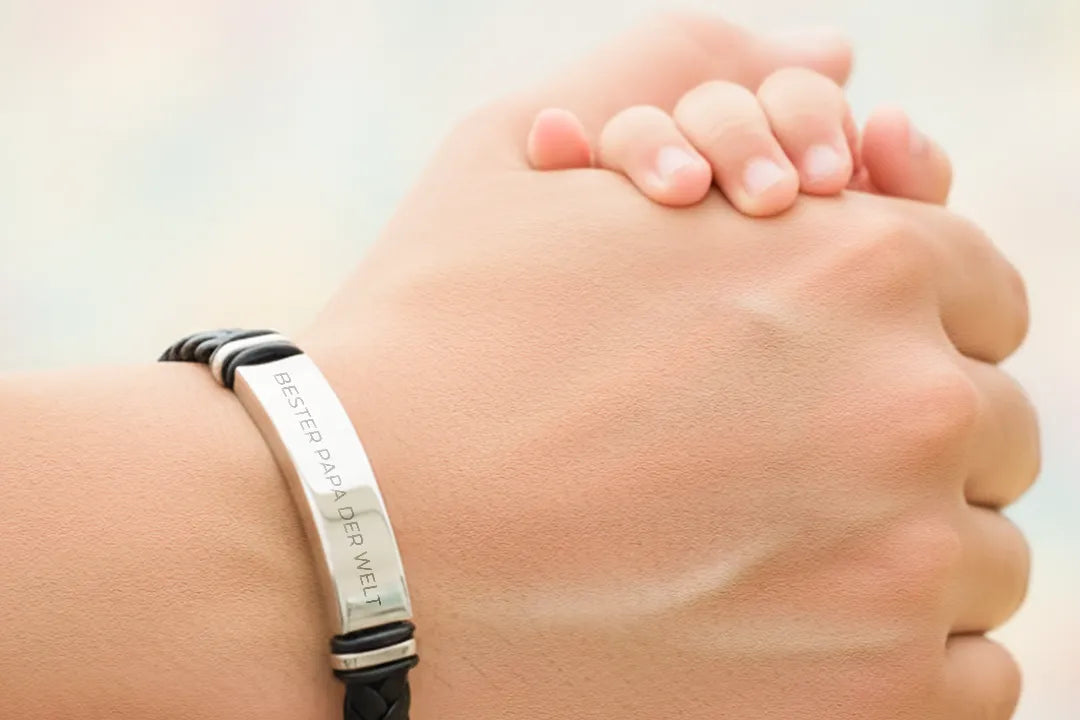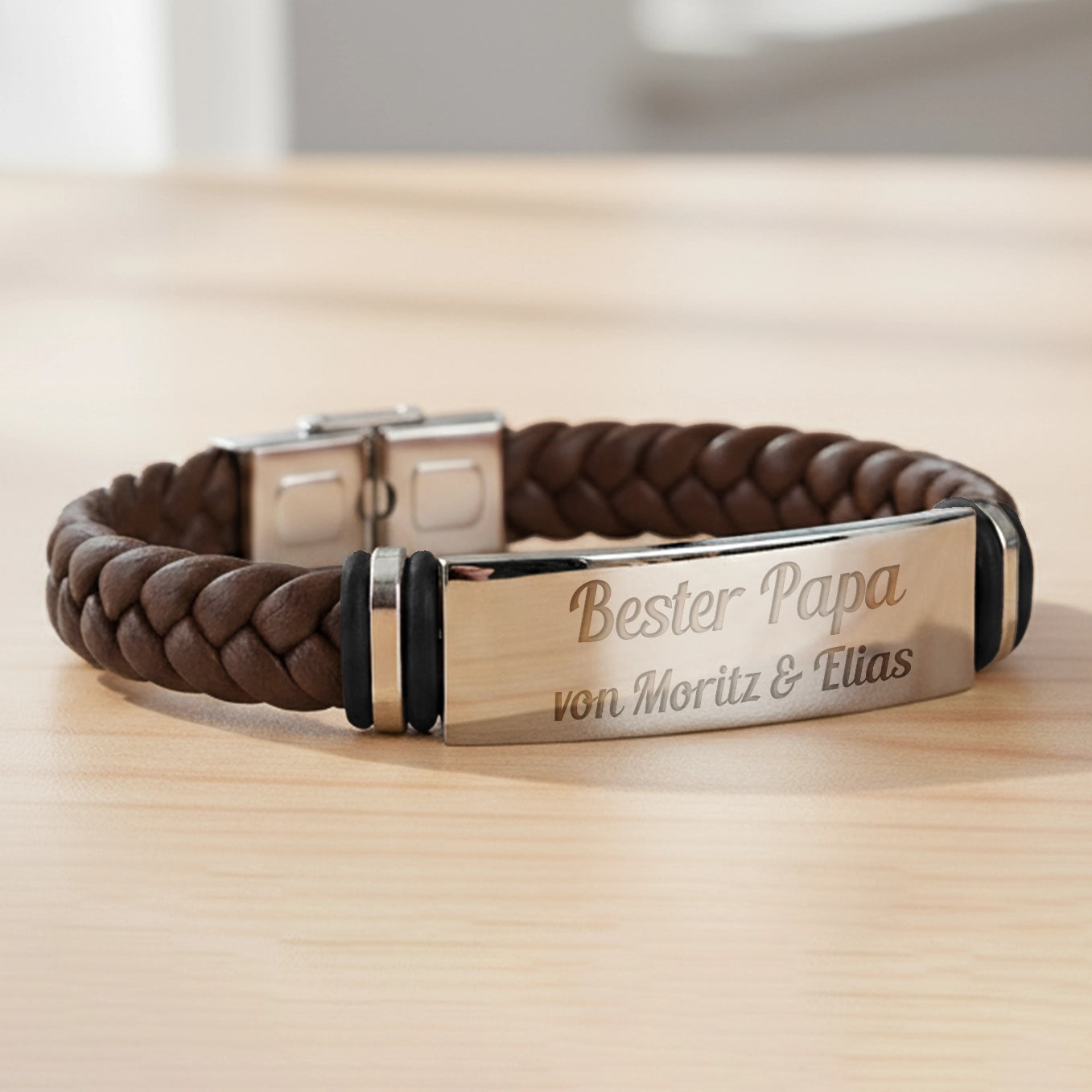 +Das Armband besteht aus robustem Kunstleder und einer gravierten Edelstahlplatte – langlebig und hautfreundlich.