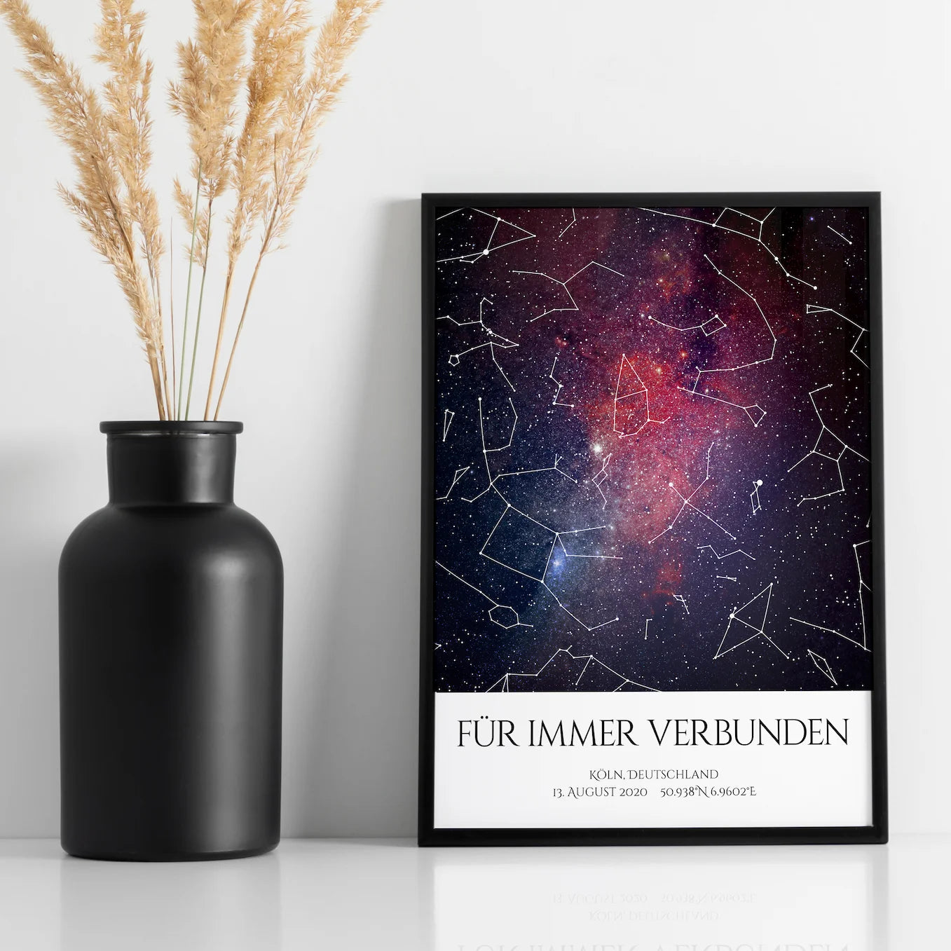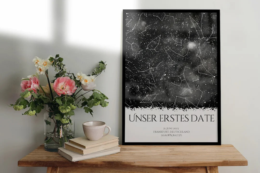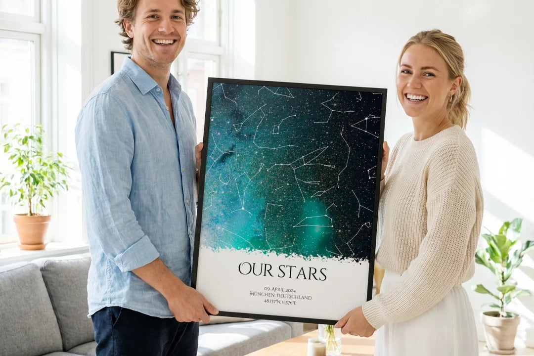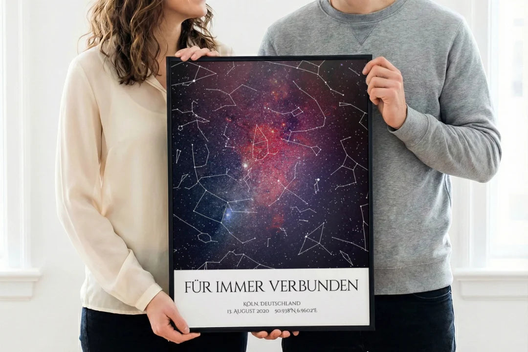 +Der Sternenhimmel basiert präzise auf Datum, Uhrzeit und Ort – so entsteht eine authentische Himmelskarte eures besonderen Moments.