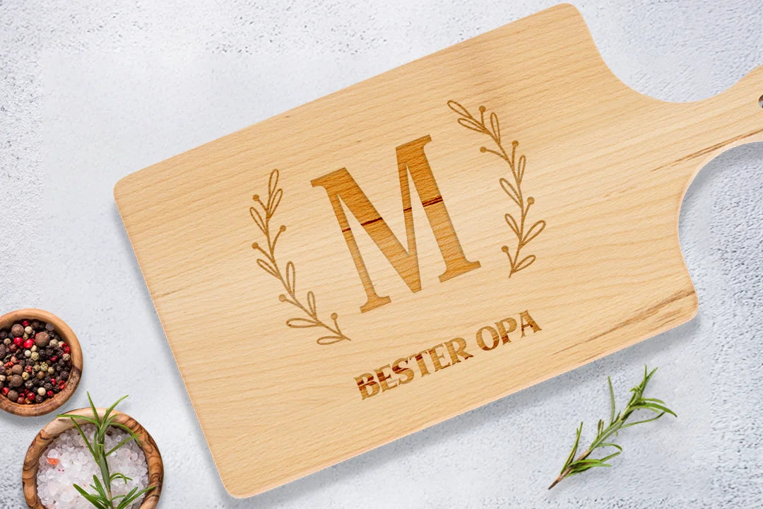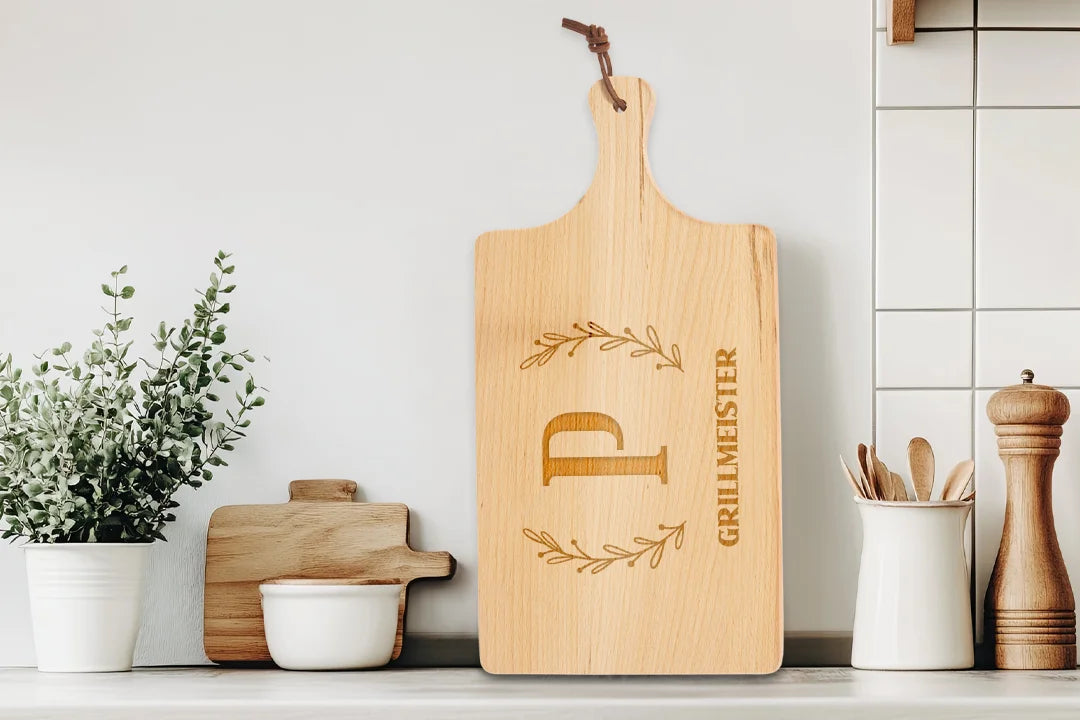 +Ja, das Brett verfügt über einen praktischen Holzgriff mit Lederband, sodass es einfach aufgehängt werden kann.